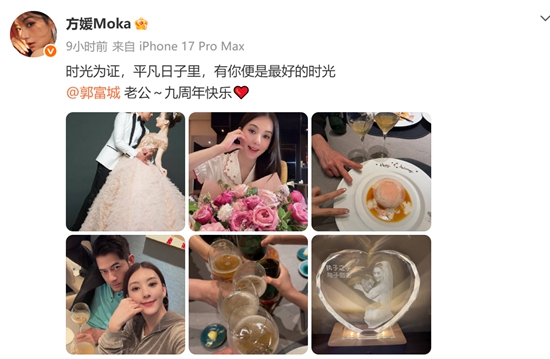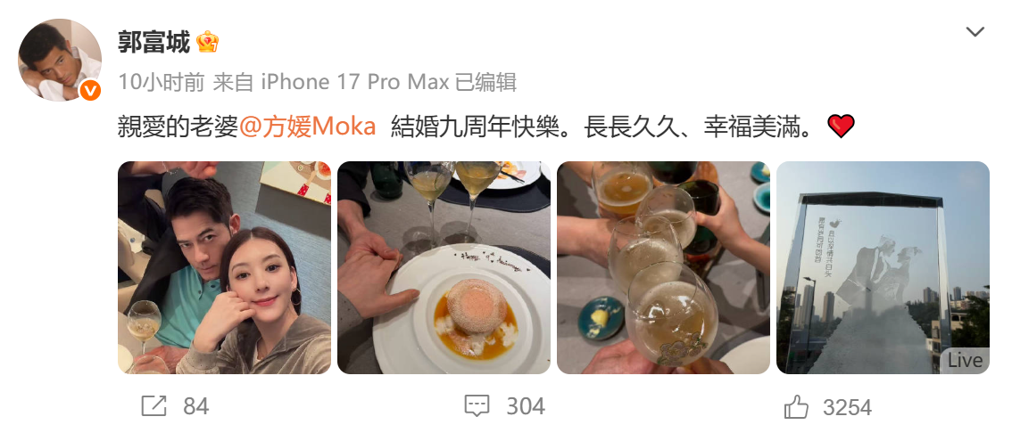 当天,郭富城率先在微博晒出两人约会合照,照片中两人并肩而坐,笑容温柔,郭富城单手比出“9”的手势,贴心呼应九周年,配文写道:“亲爱的老婆结婚九周年快乐,长长久久、幸福美满”,简单直白的话语里,满是藏不住的宠溺。